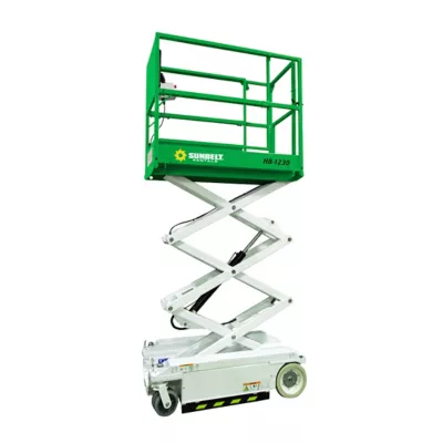 - 12’-13’ lightweight electric scissor lift rental reaches up to 19’ working height